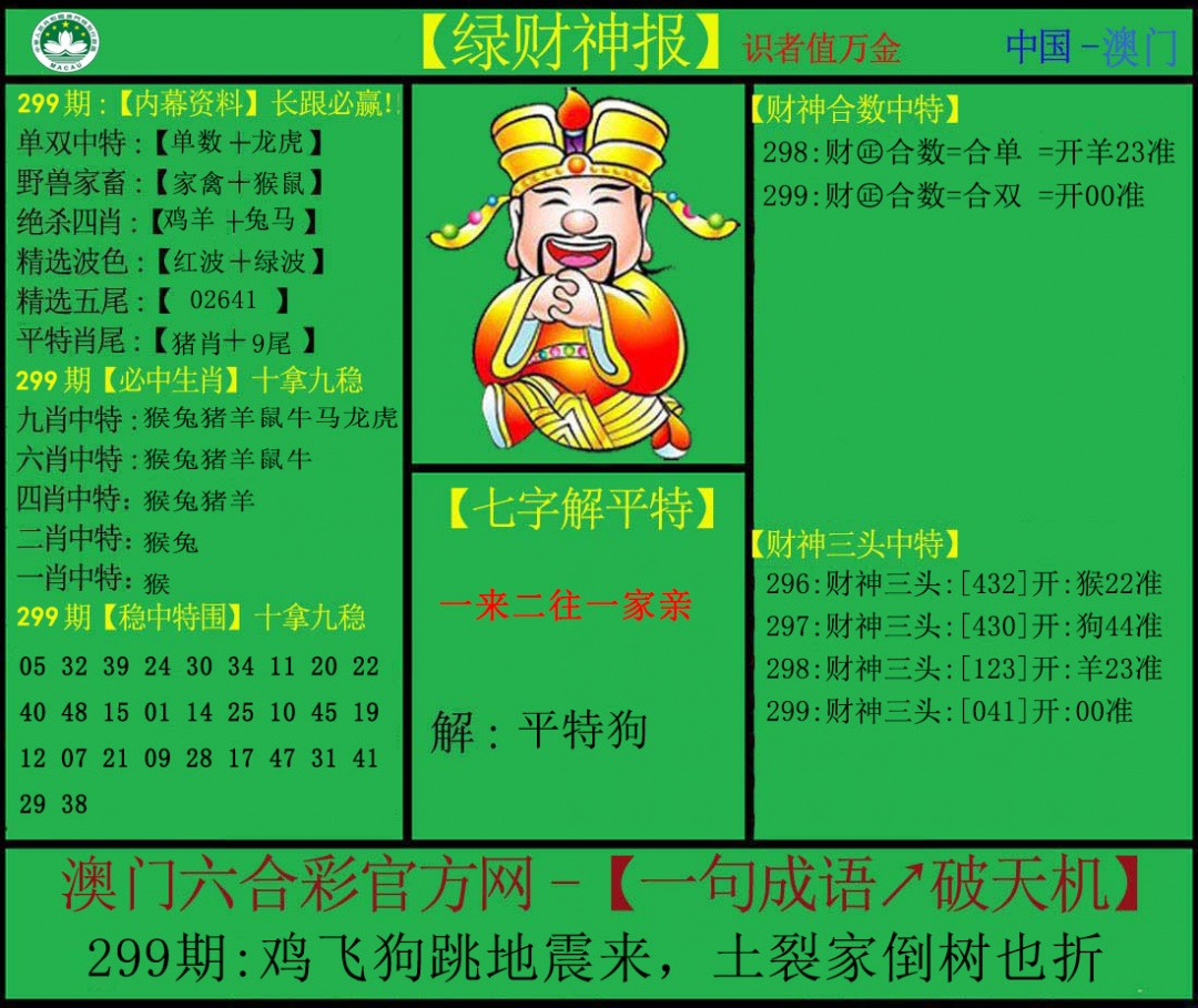 299期:澳门六合彩彩圖信封【绿财神报】每期自动更新